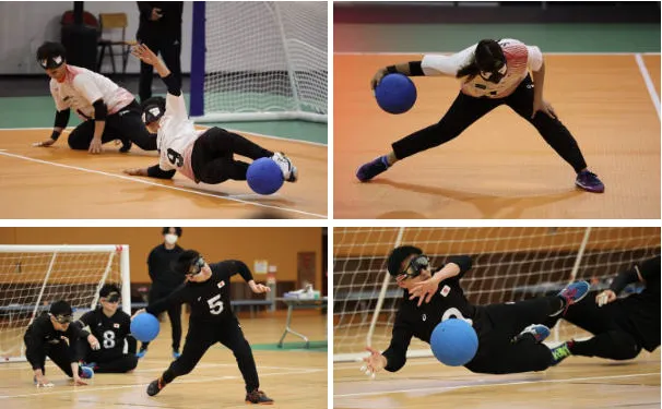 鈴の入ったボールを転がすように投げ合い、味方ゴールを守りながら、相手ゴールにボールを入れて得点を競う競技です。選手全員が視野や視力といった障害の程度の差が出ないようにアイシェード(目隠し)をつけ、視覚以外のすべての感覚を研ぎ澄まし、音と味方の声などを頼りにプレーをしていきます。