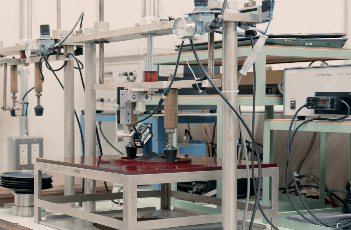 また、自社で独自開発した設備も存在します。「振動リード型物性測定装置」は振動の伝搬速度や減衰率を数値化測定できる機械で、振動板材料がスピーカに適合するかを判断できます。ここまで細かく分析する企業は少ないですが、これらの設備を使うことで、より良い音を生み出す振動板材料の開発が実現できます。