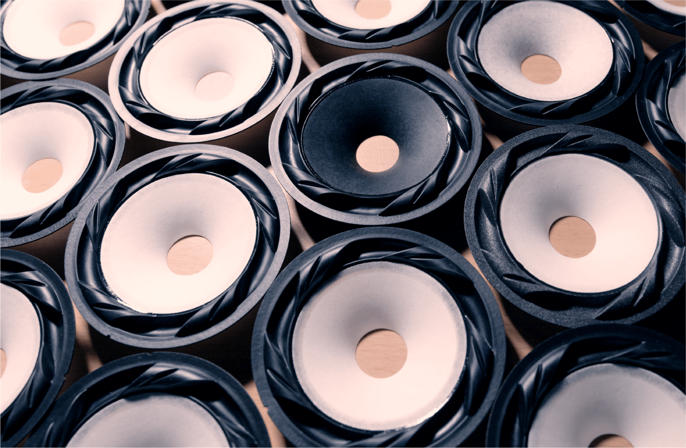 「振動板」とは、振動を通して音を発生させる部品を指し、すべてのスピーカに搭載されています。この部品の性能が音質に大きく影響を与えることから「音に個性をのせる、スピーカのキーパーツ」ともいえます。