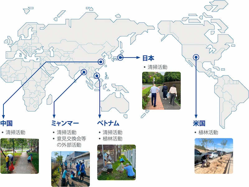 中国、ベトナム、ミャンマー、アメリカの拠点では、環境知識や廃棄物管理に関するワークショップや社内研修、敷地内の植栽活動、緊急対応のための訓練等を実施し、環境意識の向上を図っています。また、環境保護や自然との共生をテーマに工場周辺の清掃活動を実施し、生物多様性を意識した活動を行いました。