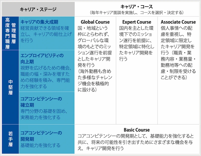 キャリア形成に対する社員自身の主体的な取り組みは必要不可欠です。自身がどのような成長を望み、どのようなスキルを身につけることが必要か、社員自らの意思で考え行動することが、人づくりの礎となり、より高い付加価値を生み出す源泉になります。一人ひとりのキャリアプランやライフステージにあわせて、柔軟に選択肢を選ぶことができる「キャリアコース制度」を設けることにより、社員の自律的成長を促し、支援しています。