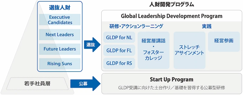 GLDPは、2010年から本格的に取り組んできた経営人財育成プログラムを再構築し、2019年に新たに体系化したもので、主要ポストの後継者候補として選抜された対象者に対し、それぞれに適した能力開発を順次実施する選抜型の育成プログラムです。