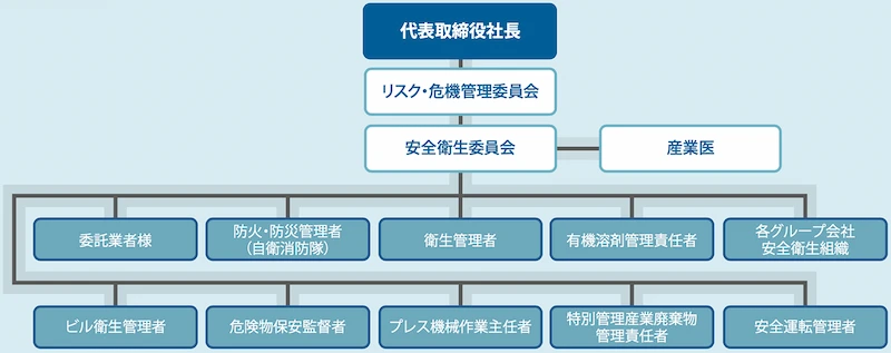 上位組織であるリスク・危機管理委員会のもと、本社安全衛生委員会と産業医が連携して運用します。また、各拠点の安全衛生管理組織の情報を共有し、グループが一丸となって職場環境の整備に取り組んでいます。